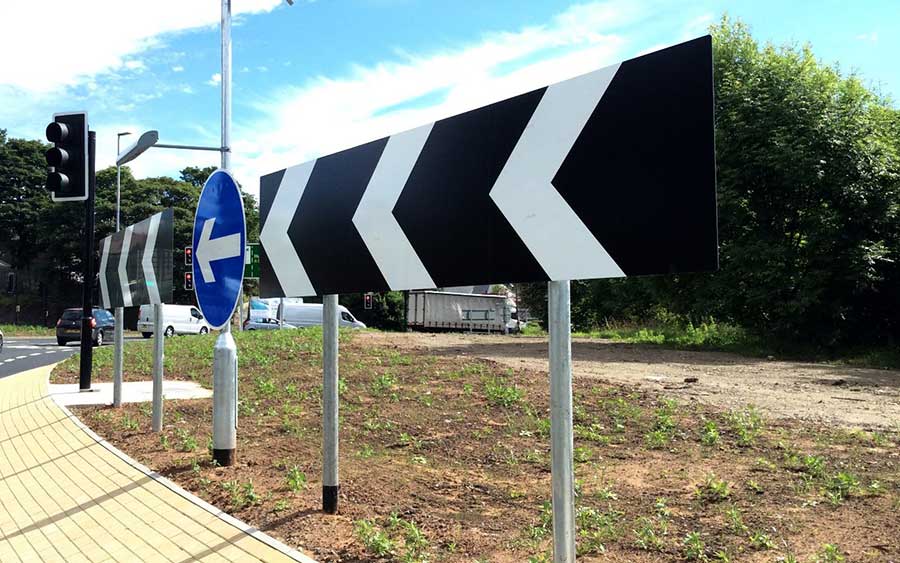 The post mounted road signage system utilises both stock, standard sign faces and bespoke cut vinyl to give the required appearance and grade of reflective.